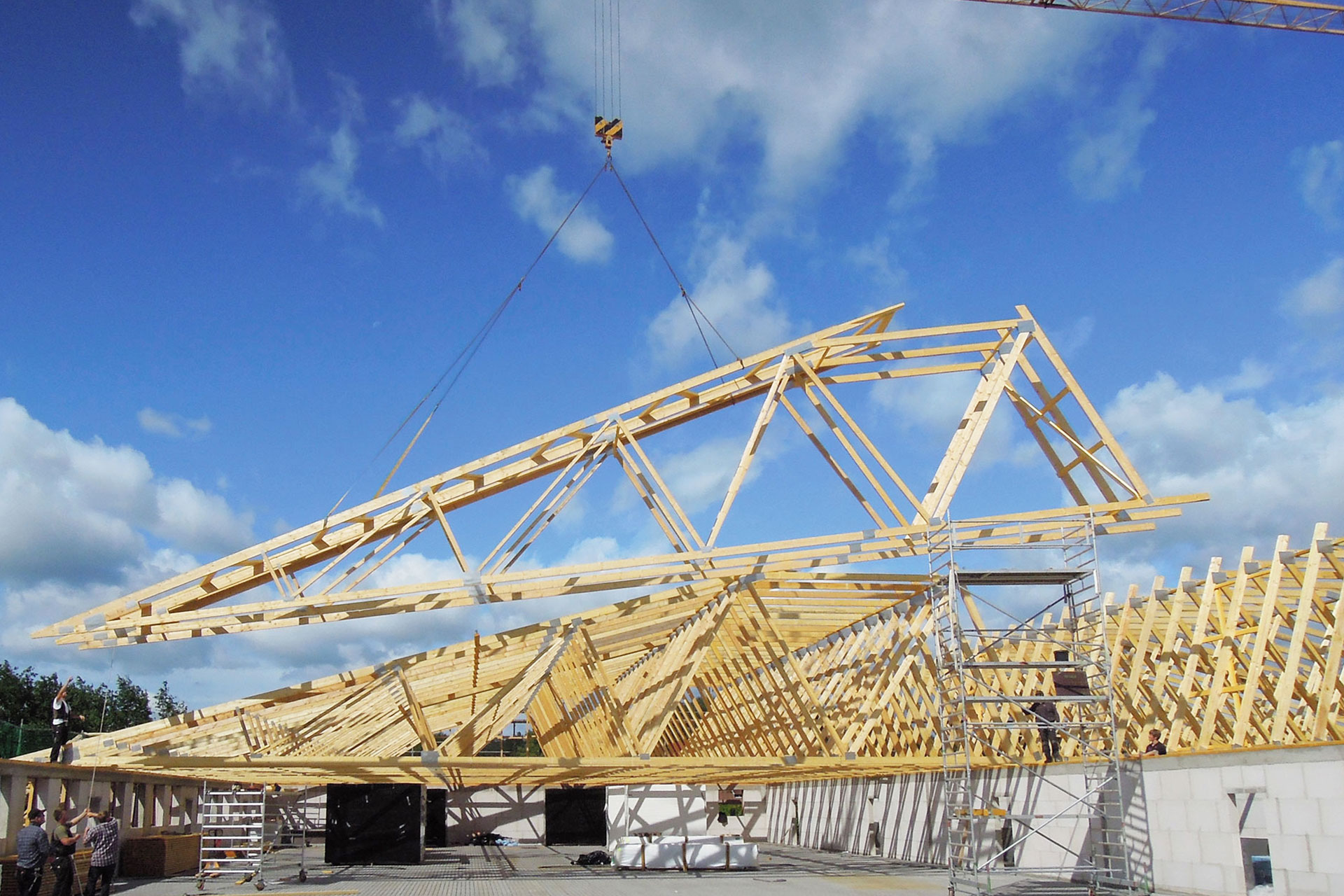 Die vielseitige, freitragende und oft stützenfreie Dachkonstruktion (bis zu 35 m sind möglich) für den gewerblichen Bau sowie öffentliche und private Bauvorhaben. Bestens geeignet z.B. für Satteldächer, Pult-, Walm- oder Zeltdächer. Auch komplizierteste Dächer können sicher und rationell geplant und gefertigt werden.